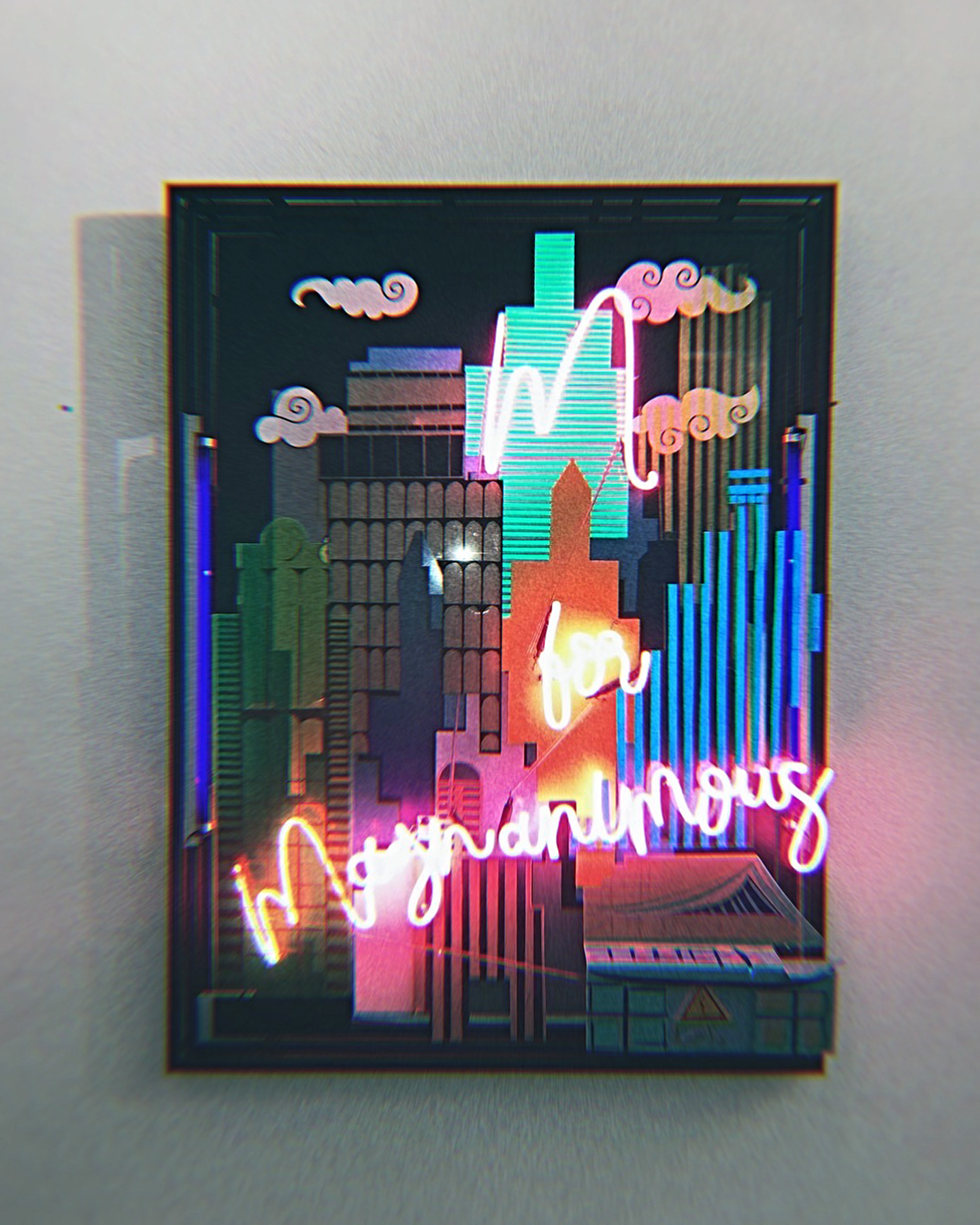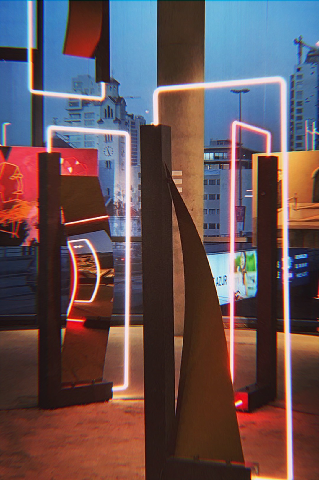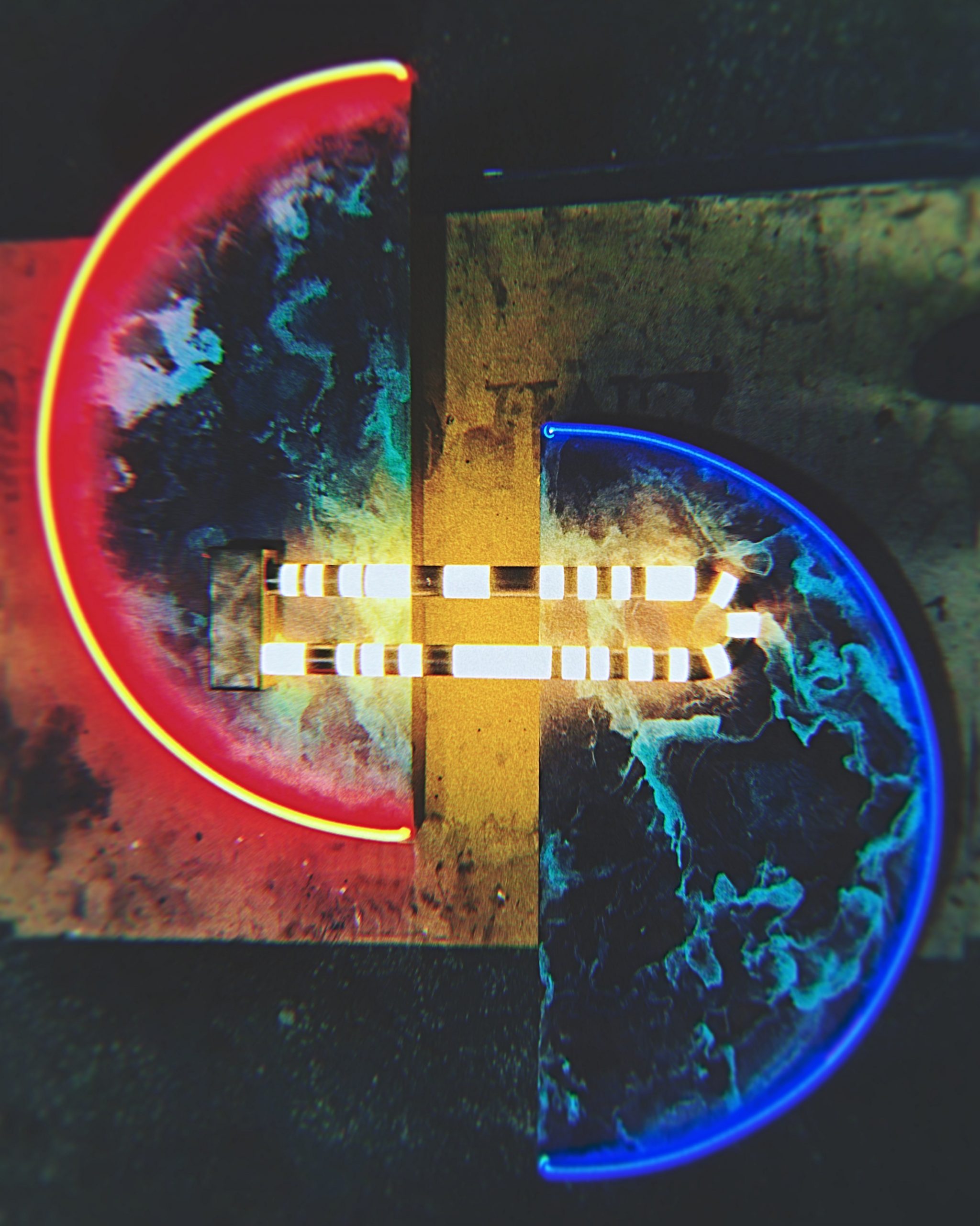 The neon-installations the artist calls Neon-Liths (referring to pre-historic megaliths such as Stonehenge) remind us of distorted space-time portals which –according to ancient astronaut theorists— were built to make contact with extra-terrestrial civilisations. What would extra- terrestrial beings witness if they looked through one of these Neon-portals? How can an artist provide a visual perspective to depict his reality?