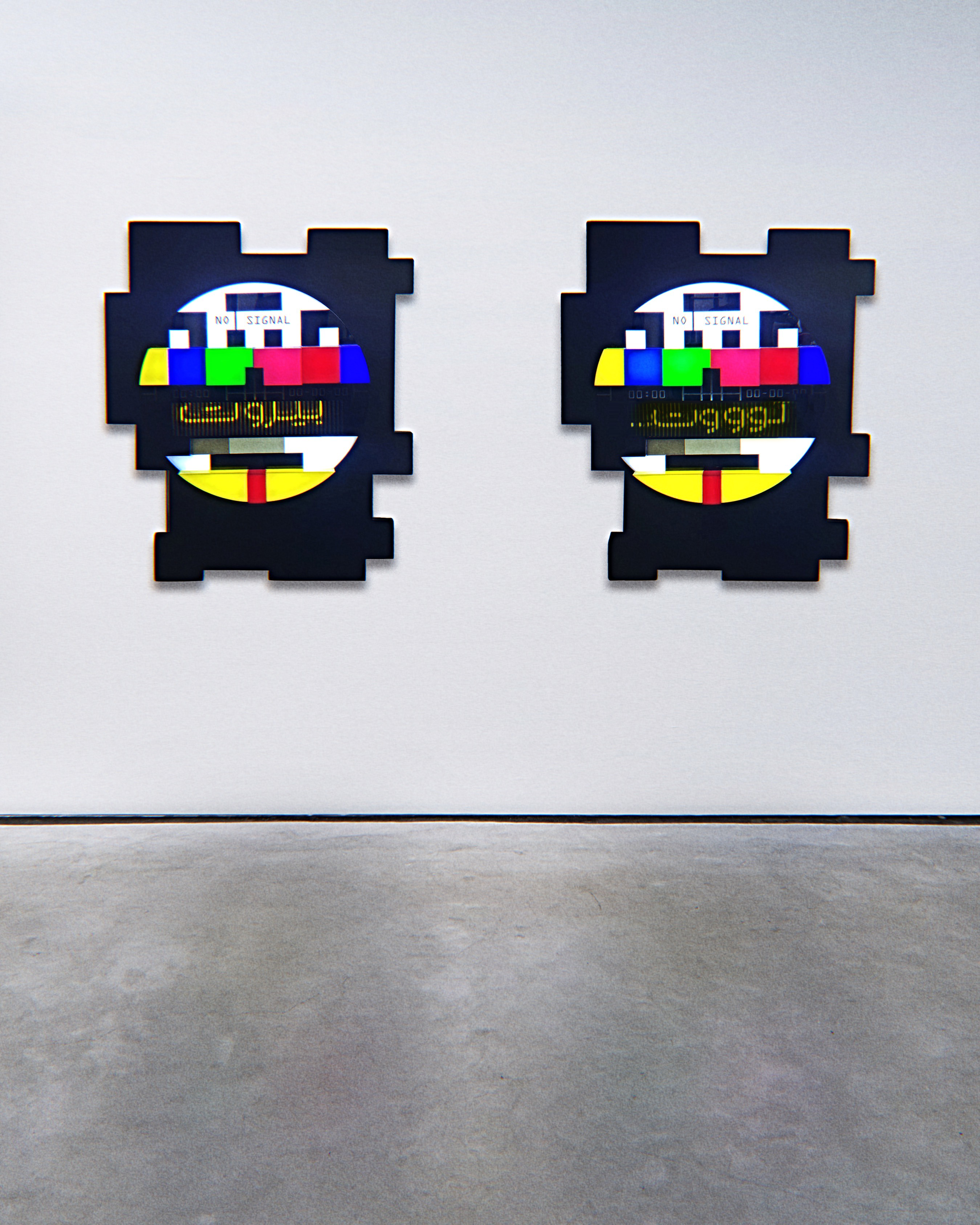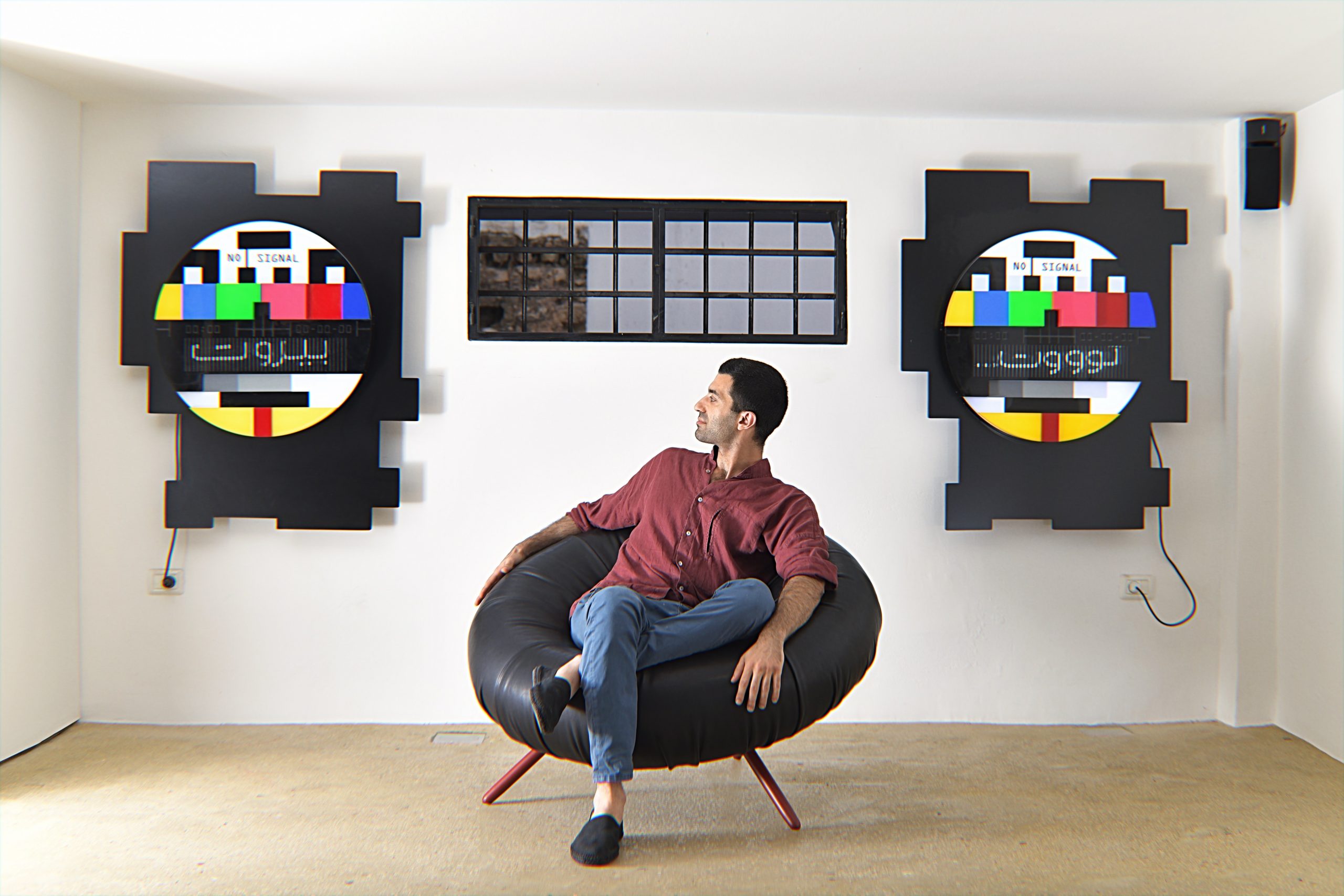 is representing the contrasting sides of the artist’s hometown. The title deliberately evokes the sound of a car horn suggesting a fun ride through the colourful city of Beirut which is underscored by the coloured surface of the perspex. By taking a closer look, the arrangement of two round shaped mixed media compositions appear to be TV test signals repeatedly flashing the words “Toot” and “Beirut”.