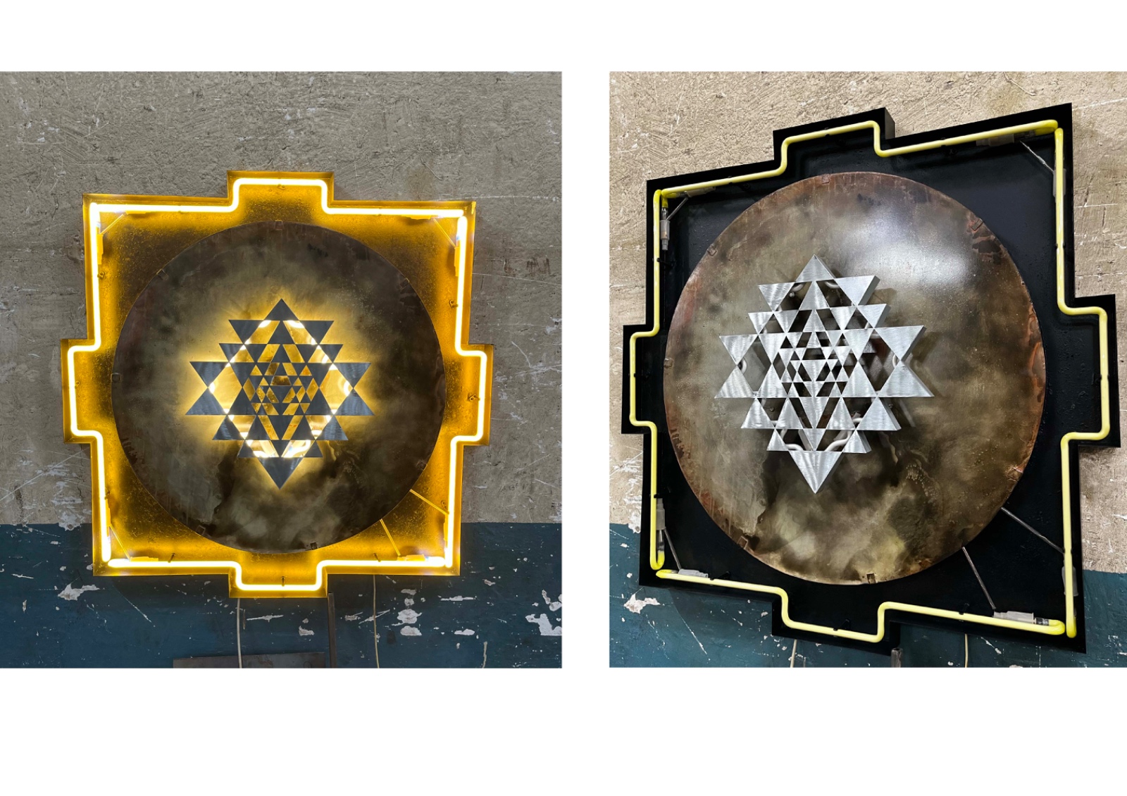 The object is based upon the Shri Yantra geometry. A yantra is an instrument or tool, for meditation and contemplation and supports spiritual liberation. In 1987, Russian scientists used EEG technology to prove that the Shri Yantra geometry quickly brings viewers to a meditative state. The Yantra is viewed as a sacred object as it is “tuned to a specific vibration of energy. In Sanskrit, the word “yantra” comes from the root word “yam,” which means “instrument” or “support,” and “tra,” derived from “trana,” meaning “release from bondage.”